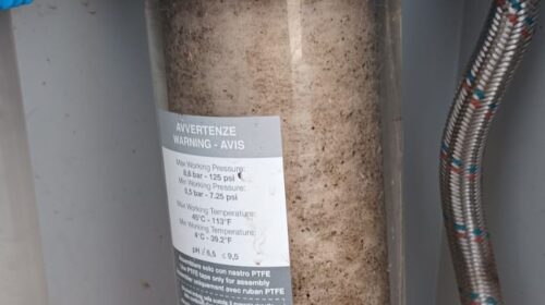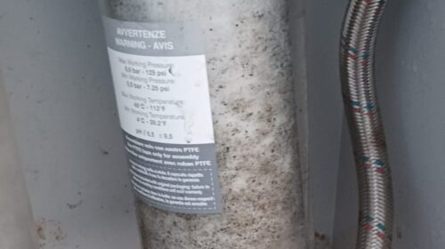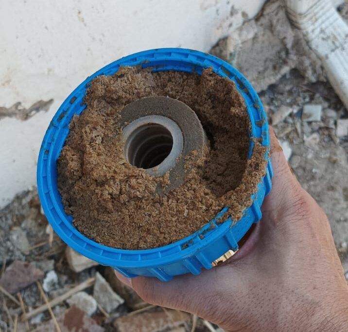En la primera foto se puede ver el filtro que pusimos el 7 de septiembre. El 8 de septiembre ya se puede apreciar cómo estaba tras solo un día. El 17 de octubre tuvimos que quitarlo porque salía muy poca agua en grifos, duchas y empezábamos a ver/notar tierra al lavarnos las manos, la cara, fregar platos… Podéis ver en las imágenes cómo estaba el filtro: PURO BARRO.