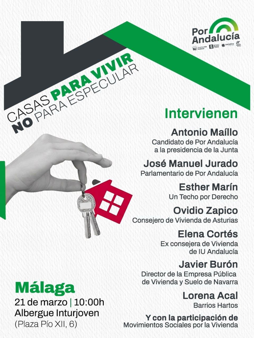 El próximo sábado, 21 de marzo, a las 10:00h, en el Albergue Inturjoven de Málaga (Plaza Pío XII, 6), tendrá lugar un importante encuentro en el que pondremos el foco en uno de los principales problemas que afecta a nuestra provincia, como es que la vivienda se entienda como un negocio y no como un derecho.